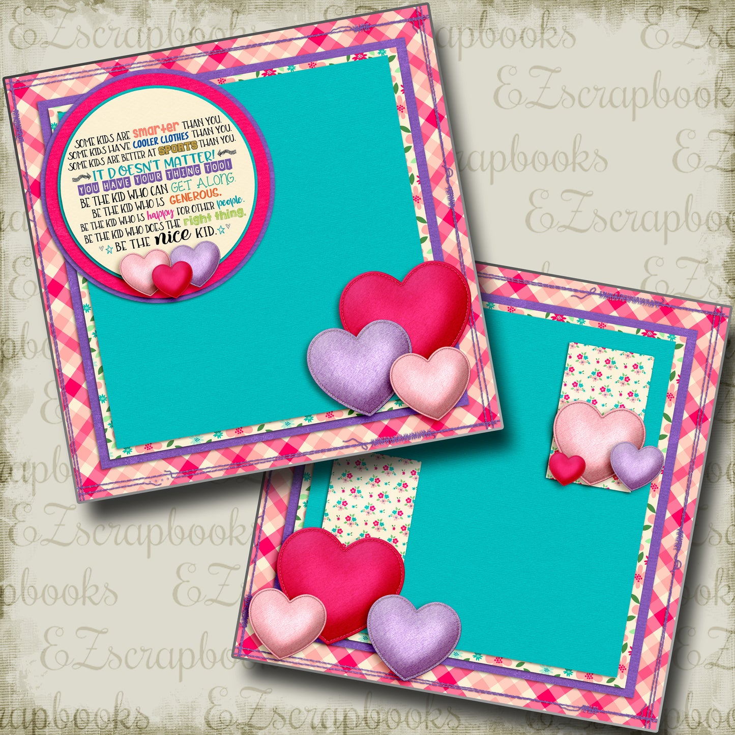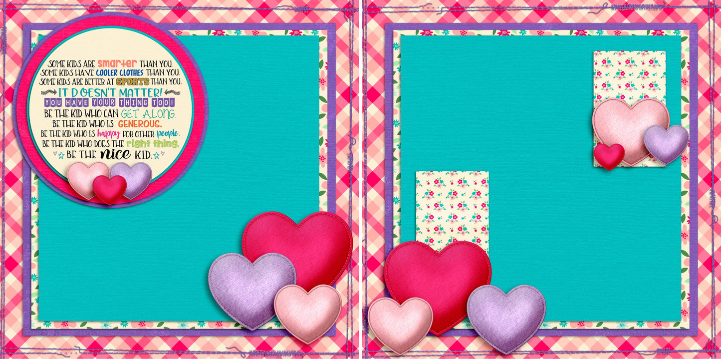 Pre-made double page scrapbook layout. Pages are 12 X 12 and professionally printed on high quality, lightly textured cardstock. Featuring artwork by Ruby Lou Designs.